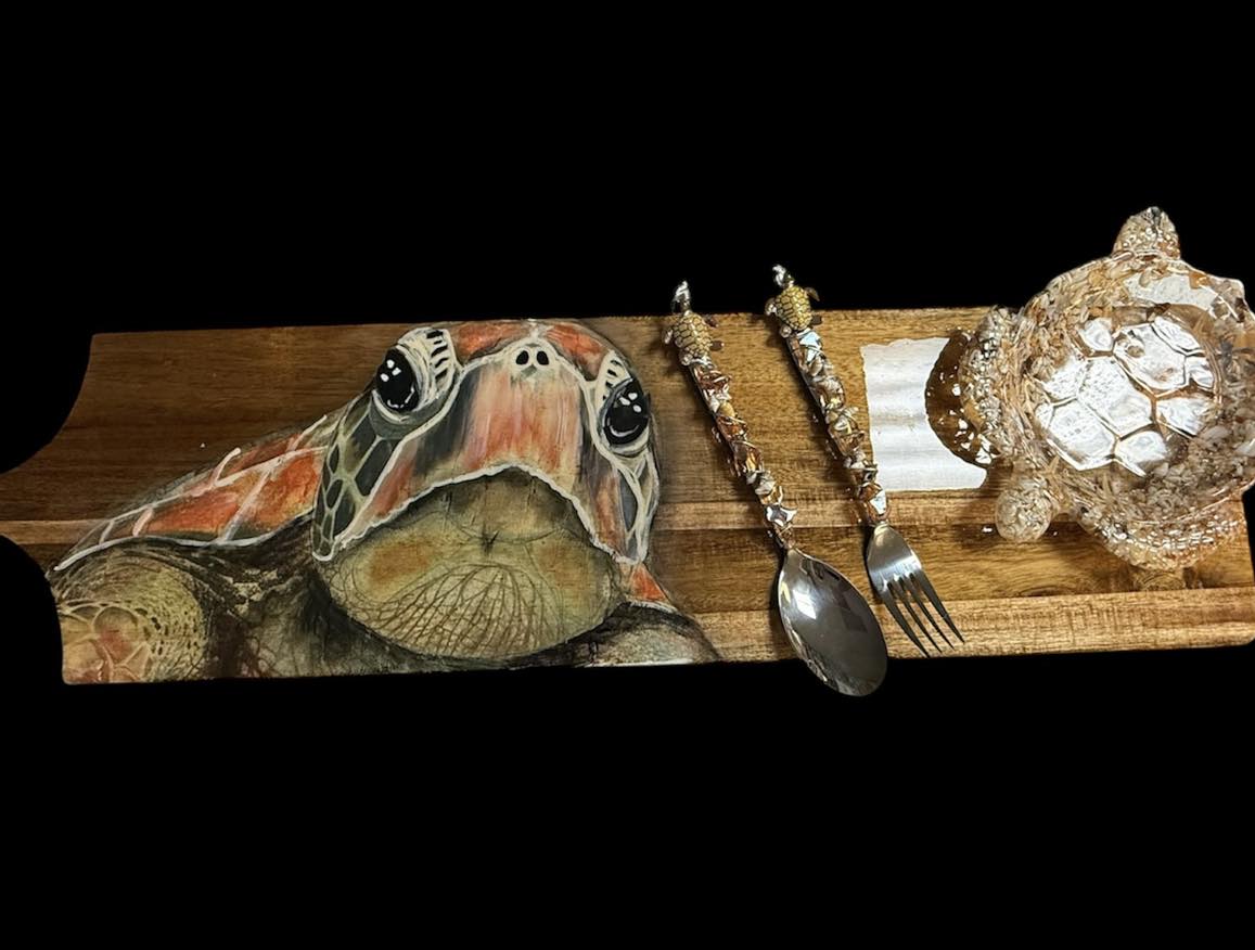 During this hands-on workshop, you will have the opportunity to learn from Sherry herself as you bring your own resin sea turtle charcuterie board to life. Using Sherry’s exclusive Decoupage paper, a carefully curated selection of multi-surface paints, and crystal-clear resin, you will transform a three-foot wooden board into a breathtaking work of art.